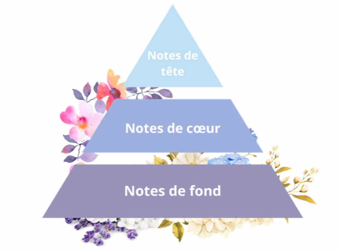 Pour composer votre parfum, nous allons utiliser la théorie de la pyramide olfactive. La pyramide olfactive sert à équilibrer la recette d'une fragrance pour la rendre harmonieuse. Elle sert également à rendre son évaporation graduelle et continue. Ainsi, les parfums délivrent tour à tours différents messages olfactifs dans le temps et ne s'offrent pas pleinement dès leur premier souffle. Ils évoluent avec vous et c'est précisément la pyramide olfactive qui contribue à rendre un parfum plus vivant. La structure traditionnelle d'un parfum se partage en trois groupes. Ces trois catégories forment ensemble la pyramide olfactive. Il y a tout d’abord les notes de tête du parfum, qui constituent la partie la plus volatile des fragrances. Ensuite, il y a les notes de cœur du parfum qui, quant à elles, se déploient pendant plusieurs heures et constituent l'odeur caractéristique d'un parfum. Enfin, il y a les notes de fond du parfum. Leur fonction principale est de fixer le parfum pour le faire durer le plus longtemps possible.